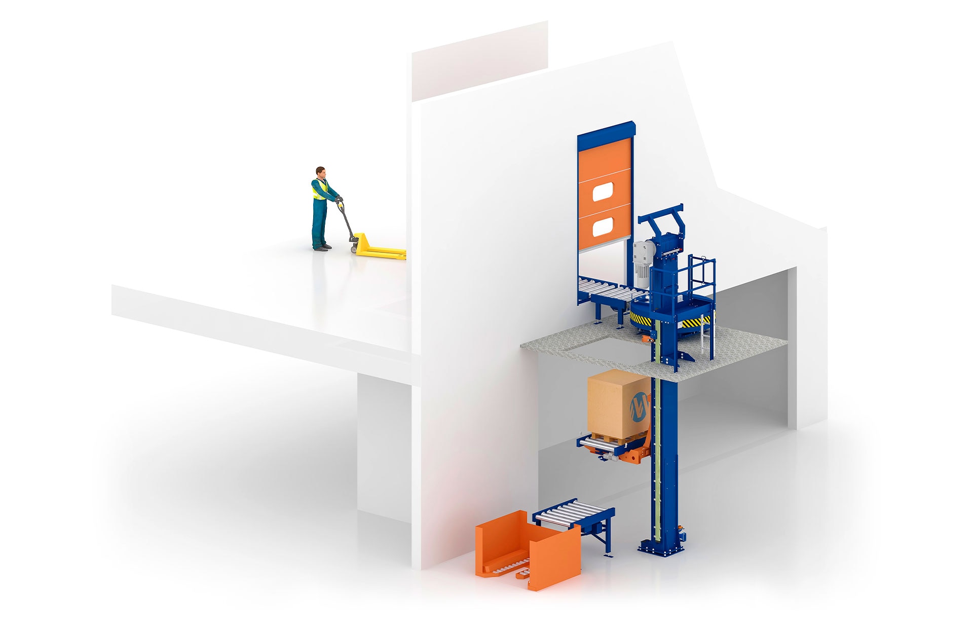 Système de transport vertical automatisé assurant l’élévation et la descente des palettes pour franchir des différences de hauteur et dynamiser le flux interne de marchandises.