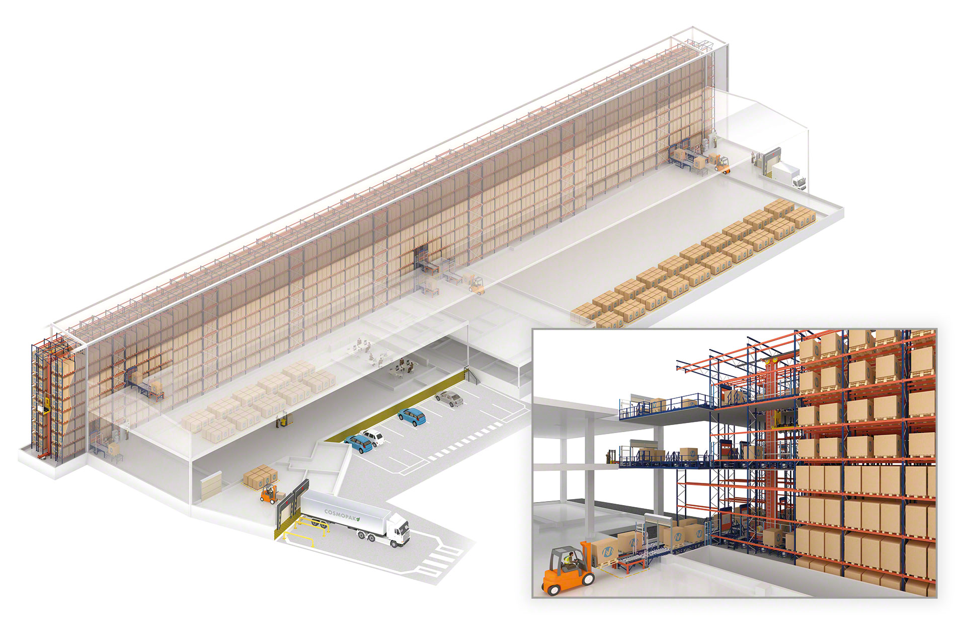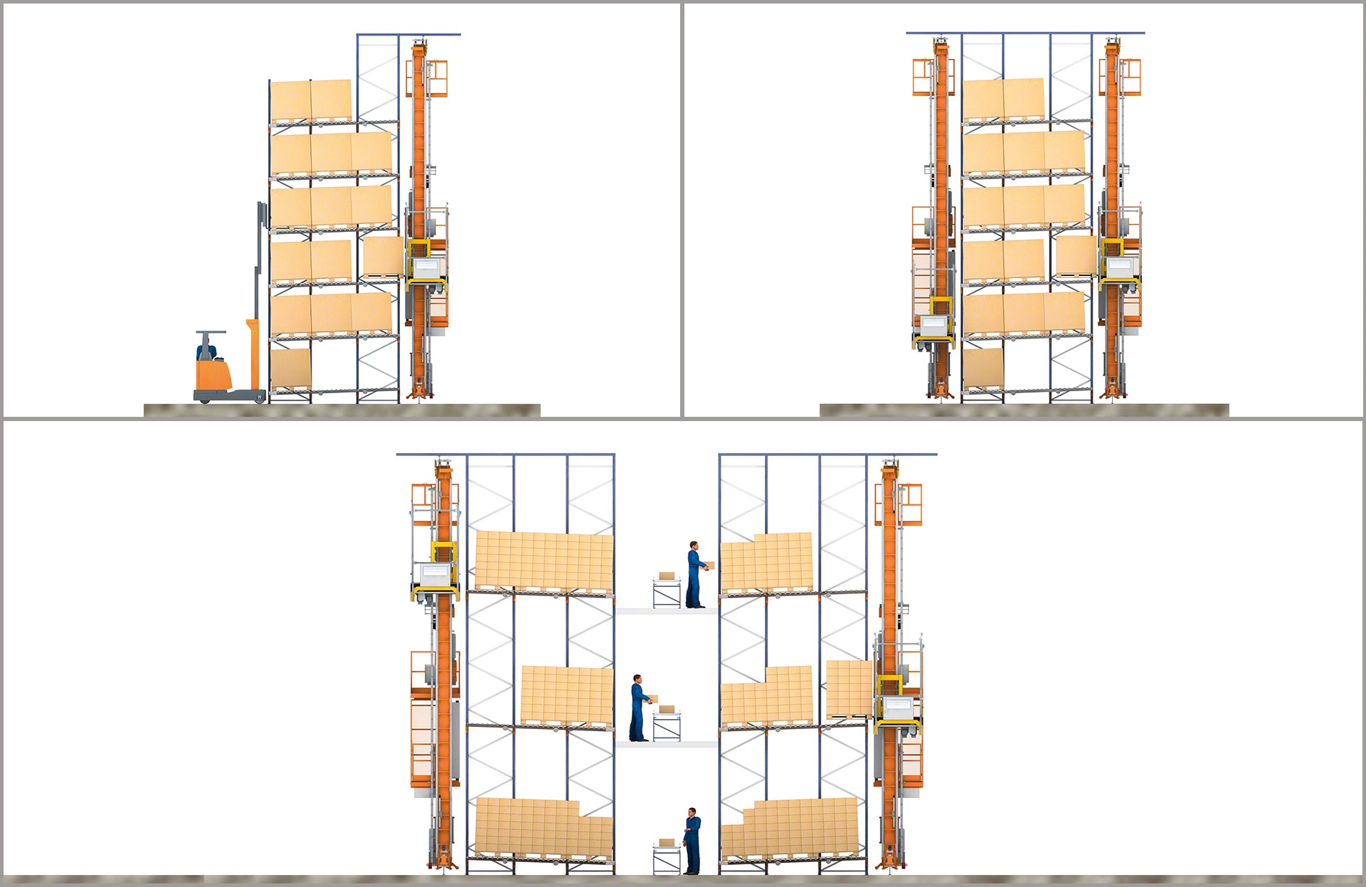 - Double profondeur et multiprofondeur : compatibles avec les rayonnages haute densité avec des canaux profonds, tels que le rack dynamique ou le système Pallet Shuttle, ainsi qu’avec les rayonnages à simple ou à double profondeur.