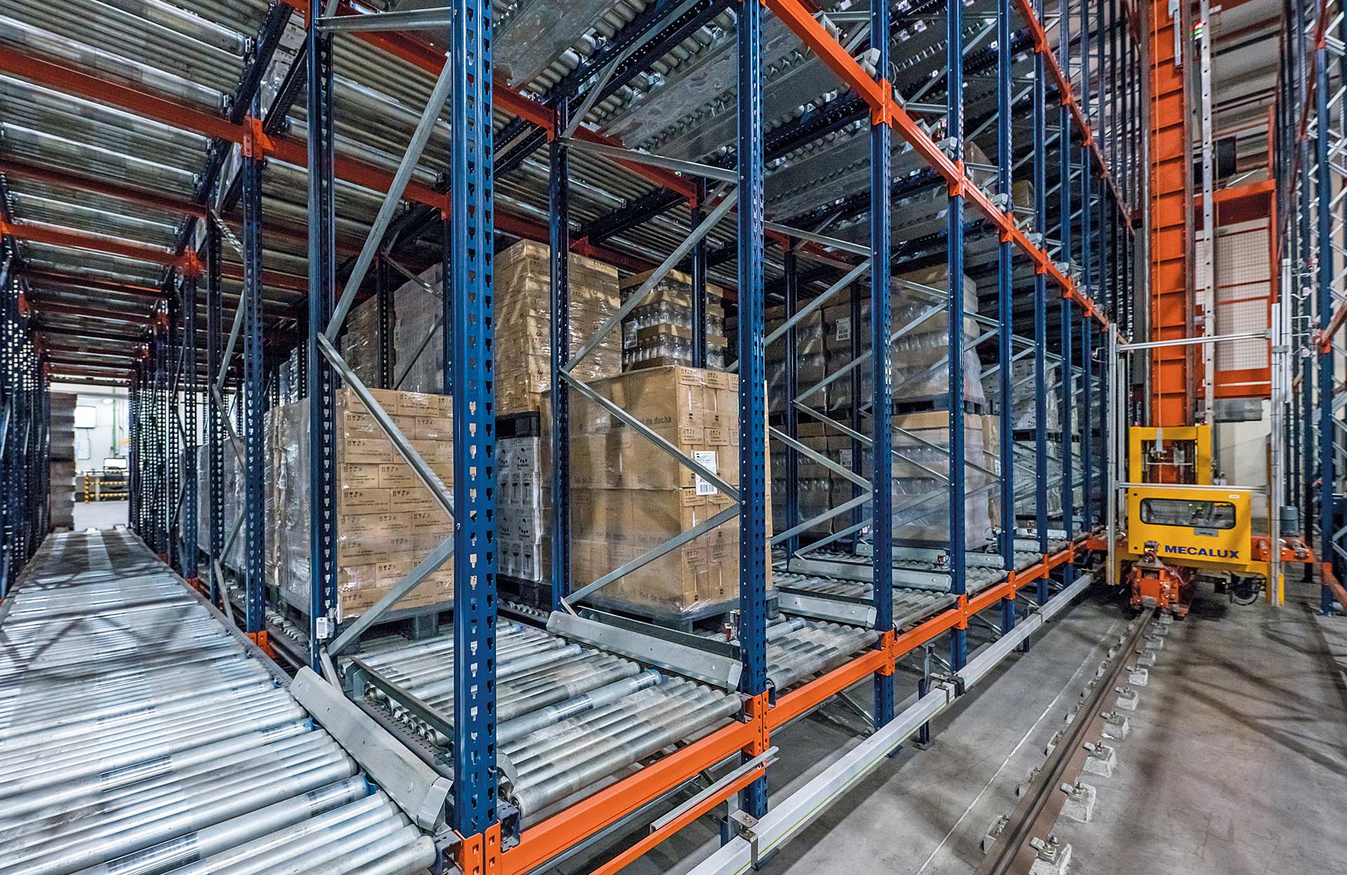 Les transtockeurs de Mecalux sont compatibles avec les rayonnages à simple ou double profondeur, les rayonnages dynamiques et le système Pallet Shuttle automatique.
